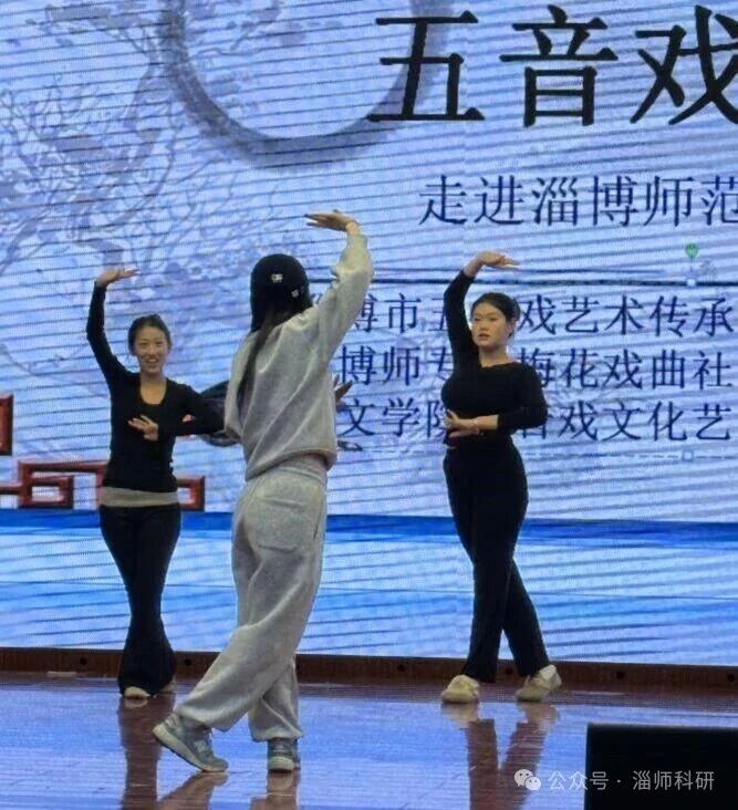11月20日,淄博师专人文学院五音戏文化传承与应用研究中心邀请淄博市五音戏剧院的路萌、路金红两位老师走进校园,为我校“小梅花”戏曲社团开展了一场深入且专业的五音戏排练指导活动。本次指导不仅是一场生动的“非遗”活态传承课,更是校地携手深化美育教育、播撒传统文化种子的具体实践。