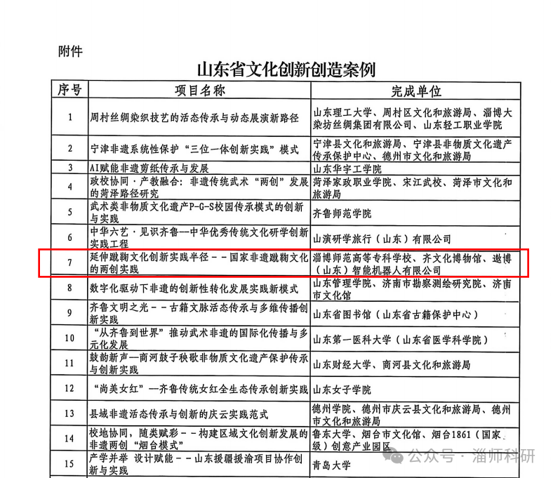 近日,山东省文化和旅游厅发布《关于公布山东省文化创新创造案例的通知》,全省共评选出181项案例。由淄博师范高等专科学校牵头,联合齐文化博物馆、遨博(山东)智能机器人有限公司共同申报的《延伸蹴鞠文化创新实践半径——国家非遗蹴鞠文化的“两创”实践》项目成功入选,位列第七。据悉,此次评选为省文旅厅首次组织开展并公布结果。