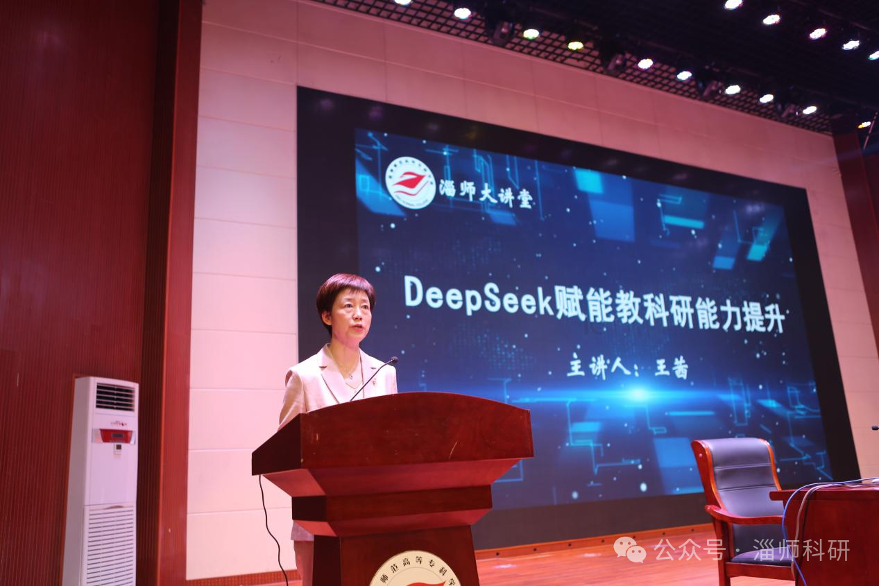 2025年4月16日下午,学校邀请鲁东大学AI前沿教育专家王茜老师来校开展了题为“DeepSeek赋能教科研能力提升”的专题讲座。学校领导班子成员、各部门单位主要负责同志及全体教师和部分附属学校教师聆听了讲座。讲座由副校长周巧玲主持。