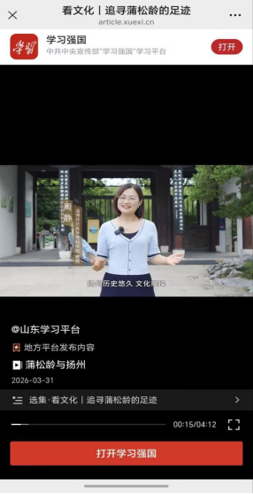 近日,由我校精心打造的31集系列视频《追寻蒲松龄的足迹》已正式上线“学习强国”山东学习平台。这是我校继《读聊斋 品教育》系列视频广受好评后,再次以数字化手段推动聊斋文化传播的力作。