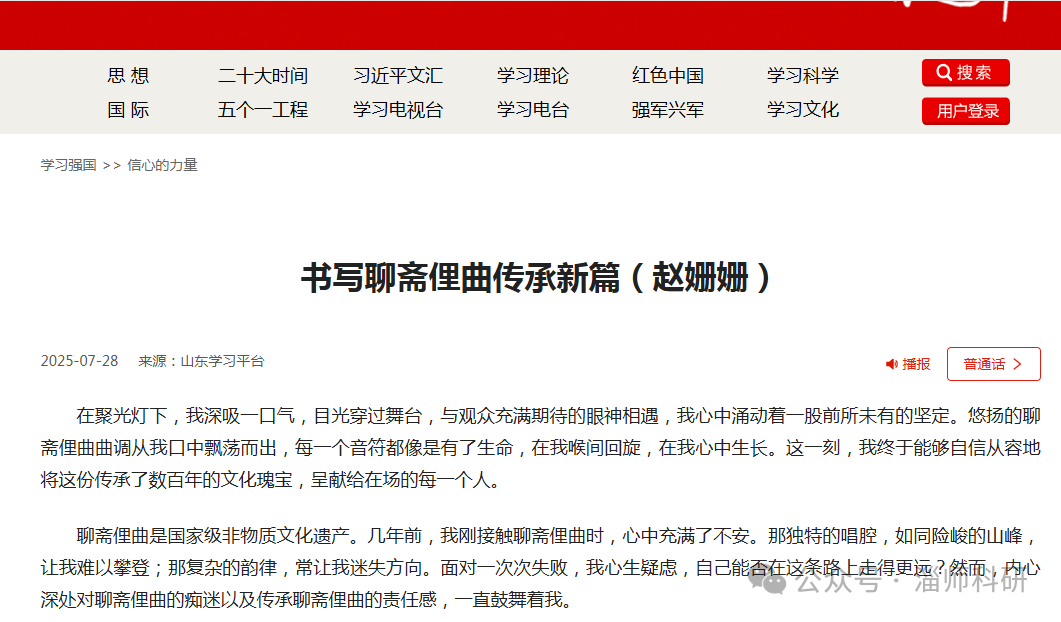 “学习强国”全国平台在广大党员干部群众中影响力大,传播力广,具有很高权威性和公信力。在这篇征文中,赵姗姗老师以真挚的笔触回顾了自己与聊斋俚曲的“双向奔赴”:初遇时被其独特的艺术韵味吸引,为探寻文化根脉主动拜访行业名师与学术专家,在一次次专业学习与反复打磨中,不仅突破了研究困境和难关,更对这门传统艺术生出难以割舍的热爱,字里行间满是对这项国家级非遗传承的热忱与坚守。